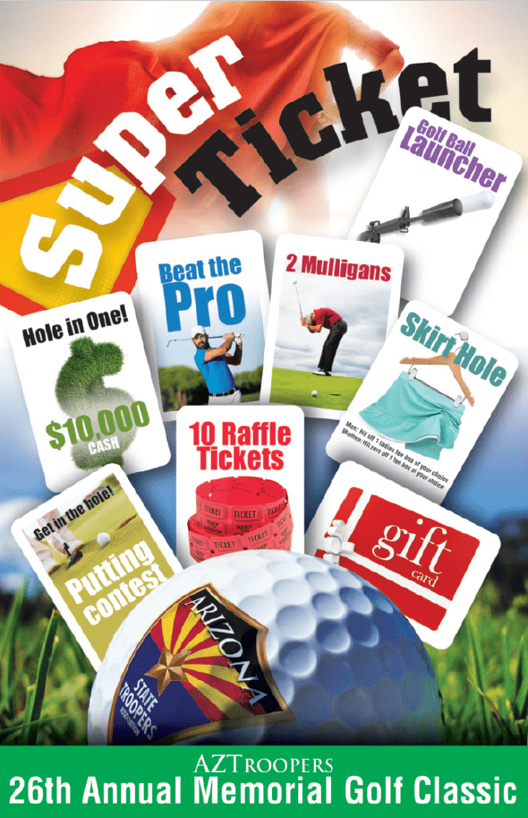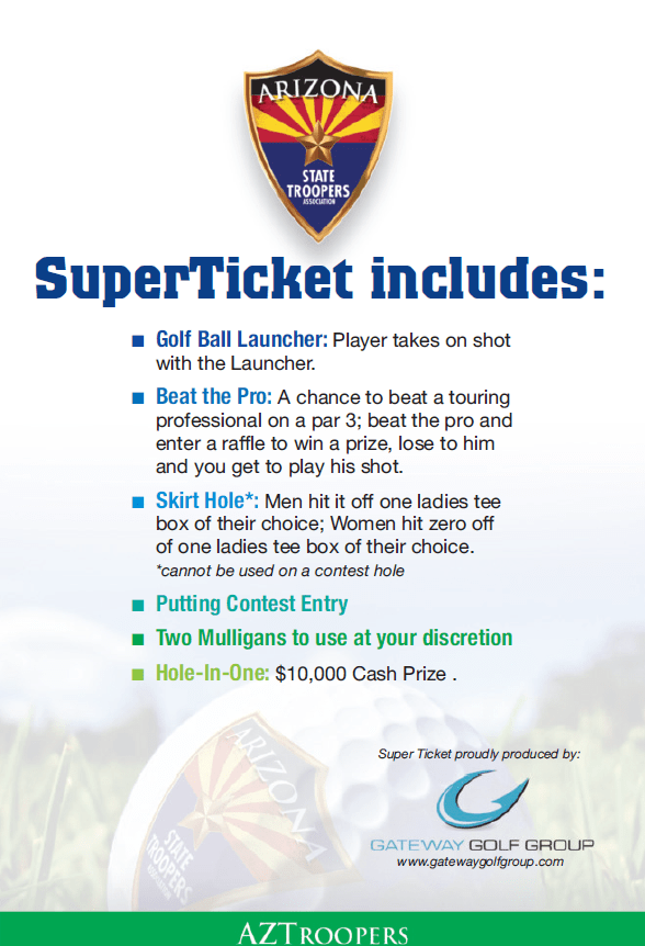 Each Super Ticket includes: 10 Raffle Tickets 2 Mulligans Beat the Pro Golf Ball Launcher Putting Contest $10,000 Hole-In-One Skirt Hole $10 GolfSmith Gift Card